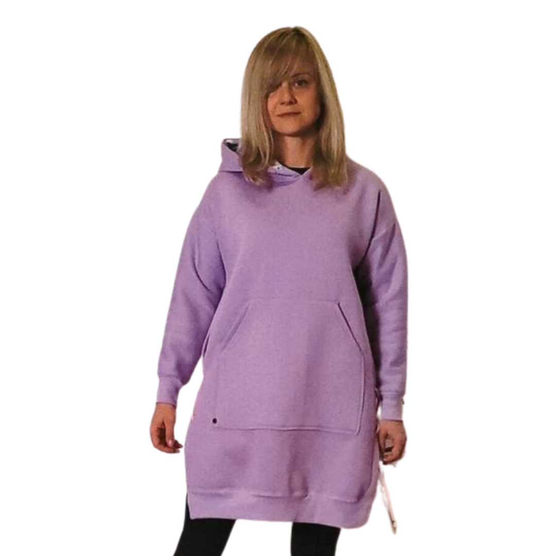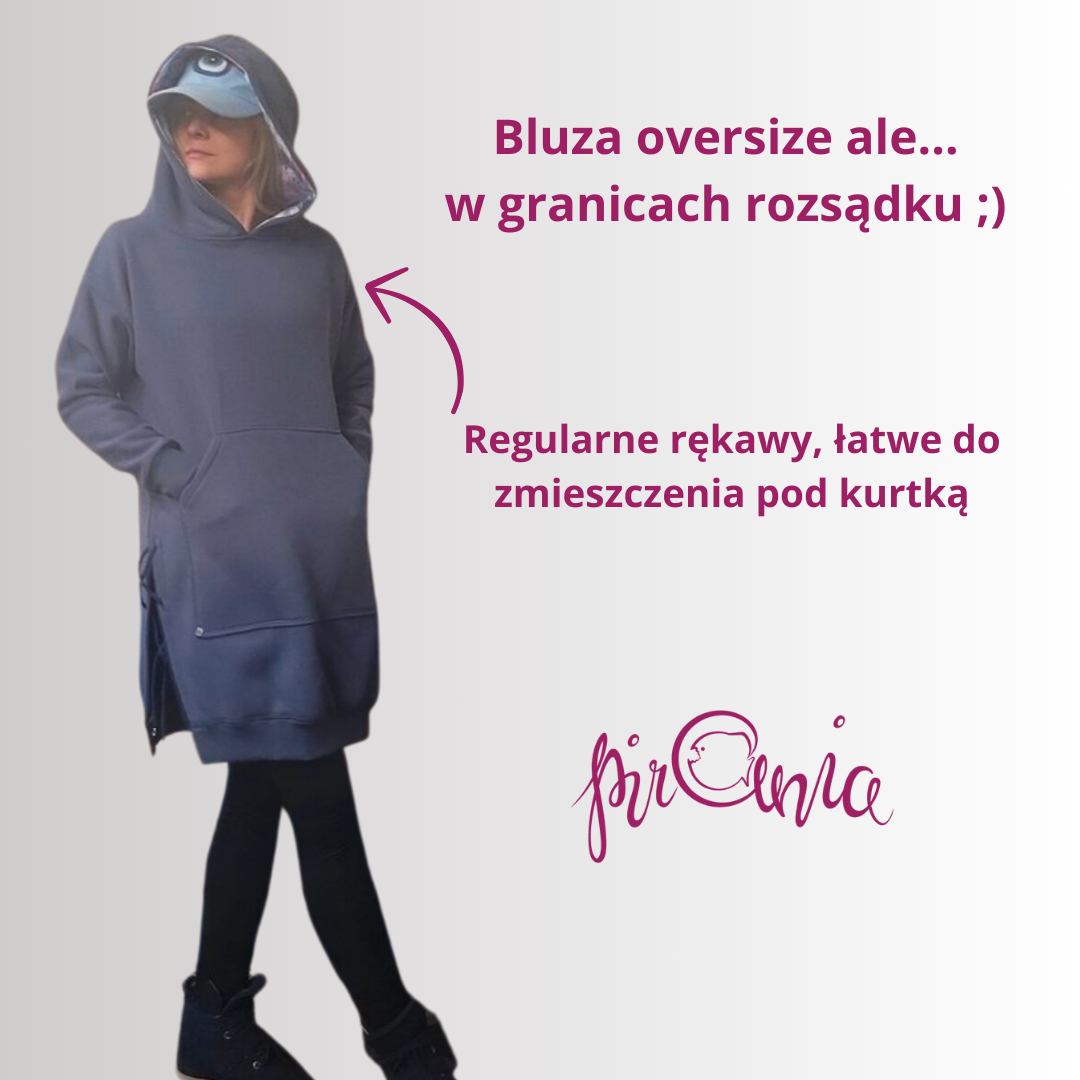 Ciepła bluza z dresówki drapanej w wersji oversize ale w granicach rozsądku :) rękawy mają standrdowy krój tak, żeby łatwo wchodziły pod kurtkę. Kaptur jest duży - tak, żeby zmieścił się na czapkę.