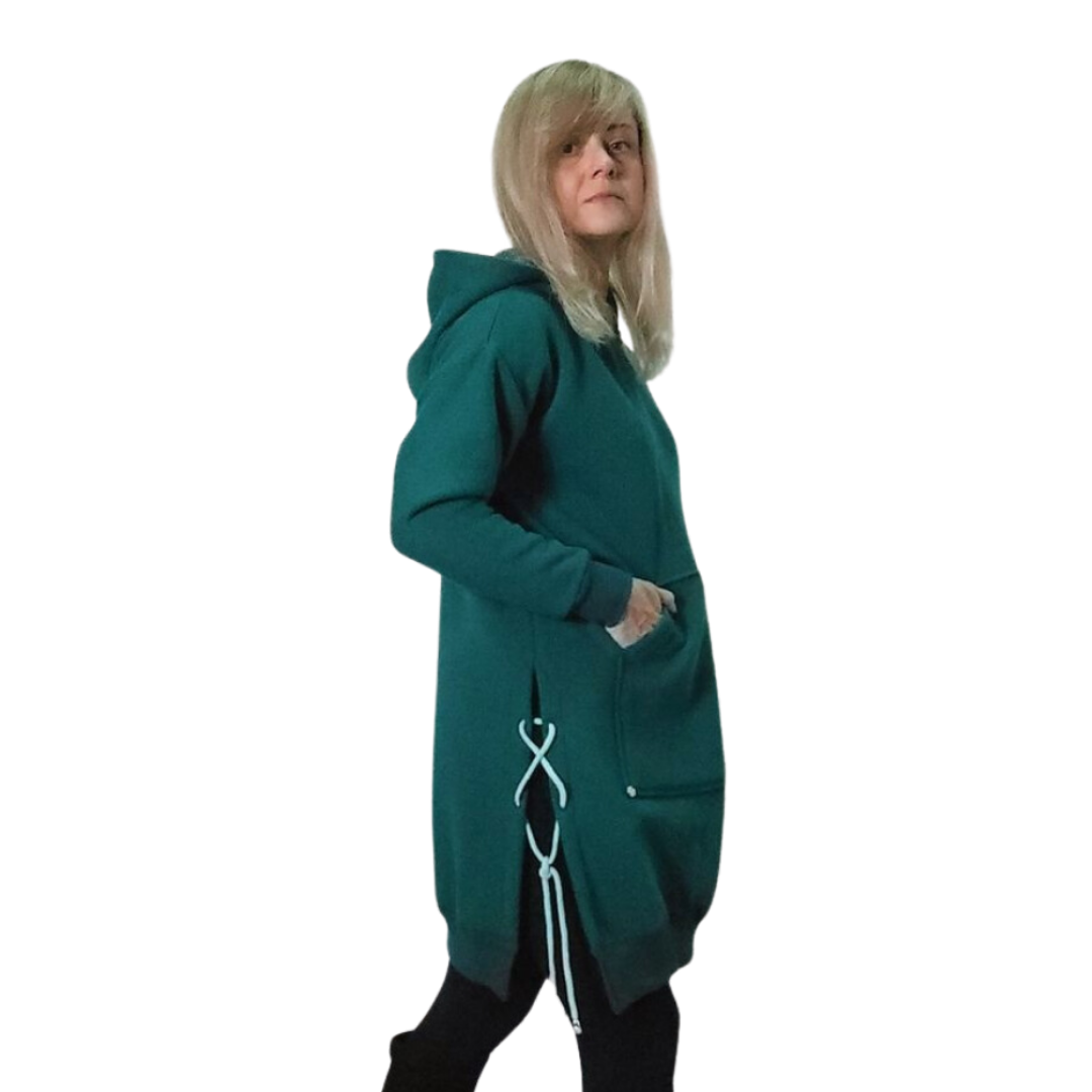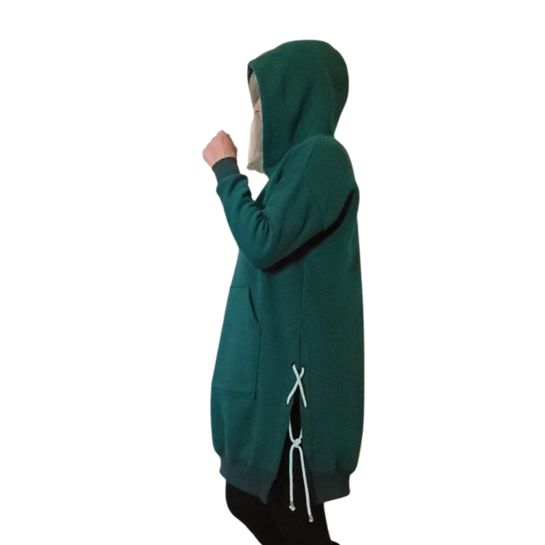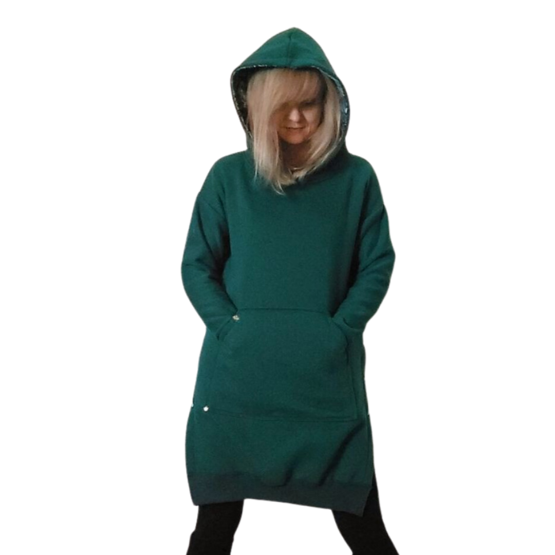 Ciepła bluza z dresówki drapanej w wersji oversize ale w granicach rozsądku :) rękawy mają standrdowy krój tak, żeby łatwo wchodziły pod kurtkę. Kaptur jest duży - tak, żeby zmieścił się na czapkę.